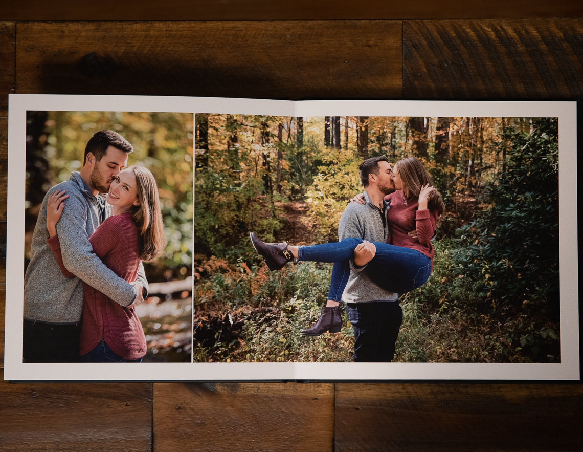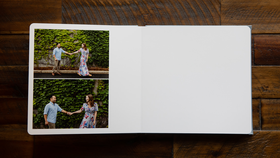 Here’s a sample of our engagement albums. These are the little sibling of our thicker, more robust wedding albums. Still with the same beautiful print quality, these keepsake albums include 30 of your favorite images with the option to add more.