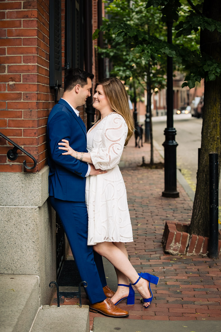 We kicked things off in Beacon Hill, right around Louisburg Square. Cobblestone streets, brick sidewalks, and classic townhomes set the tone right away. This area always photographs beautifully. It also keeps sessions calm and unrushed, which helps couples relax fast.